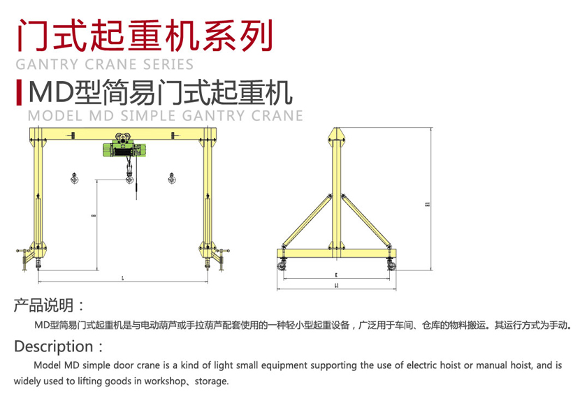 MD型簡(jiǎn)易門式起重機(jī)是與電動(dòng)葫蘆或手拉葫蘆配套使用的一種輕小型起重設(shè)備,廣泛用于車間、倉(cāng)庫(kù)的物料搬運(yùn)。