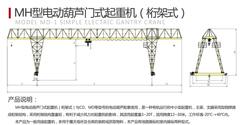MH型電動葫蘆門式起重機(jī)(桁架式)工作環(huán)境溫度為-20℃-+40℃,電源為三相交流。