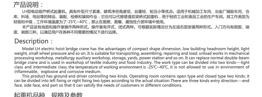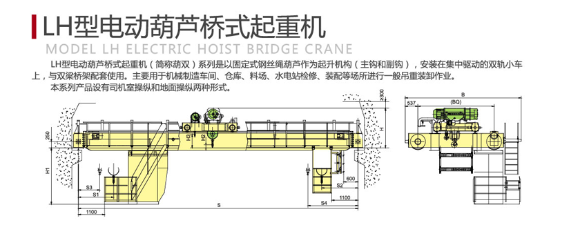 LH型電動(dòng)葫蘆橋式起重機(jī)。具有外型尺寸緊湊、建筑凈空高度低、自重輕、輪壓小等優(yōu)點(diǎn)。適用于機(jī)械加工車間、冶金廠輔助車間、倉庫、料場、電站等的轉(zhuǎn)運(yùn)、裝配、檢修和裝卸作業(yè);它也可以代替普通雙梁橋式起重機(jī),用于輕紡工業(yè)和食品工業(yè)的生產(chǎn)車間。其工作類型為輕級和中級,工作環(huán)境溫度為了-25℃~40℃,禁止在易燃、易爆、腐蝕性介質(zhì)環(huán)境中使用。