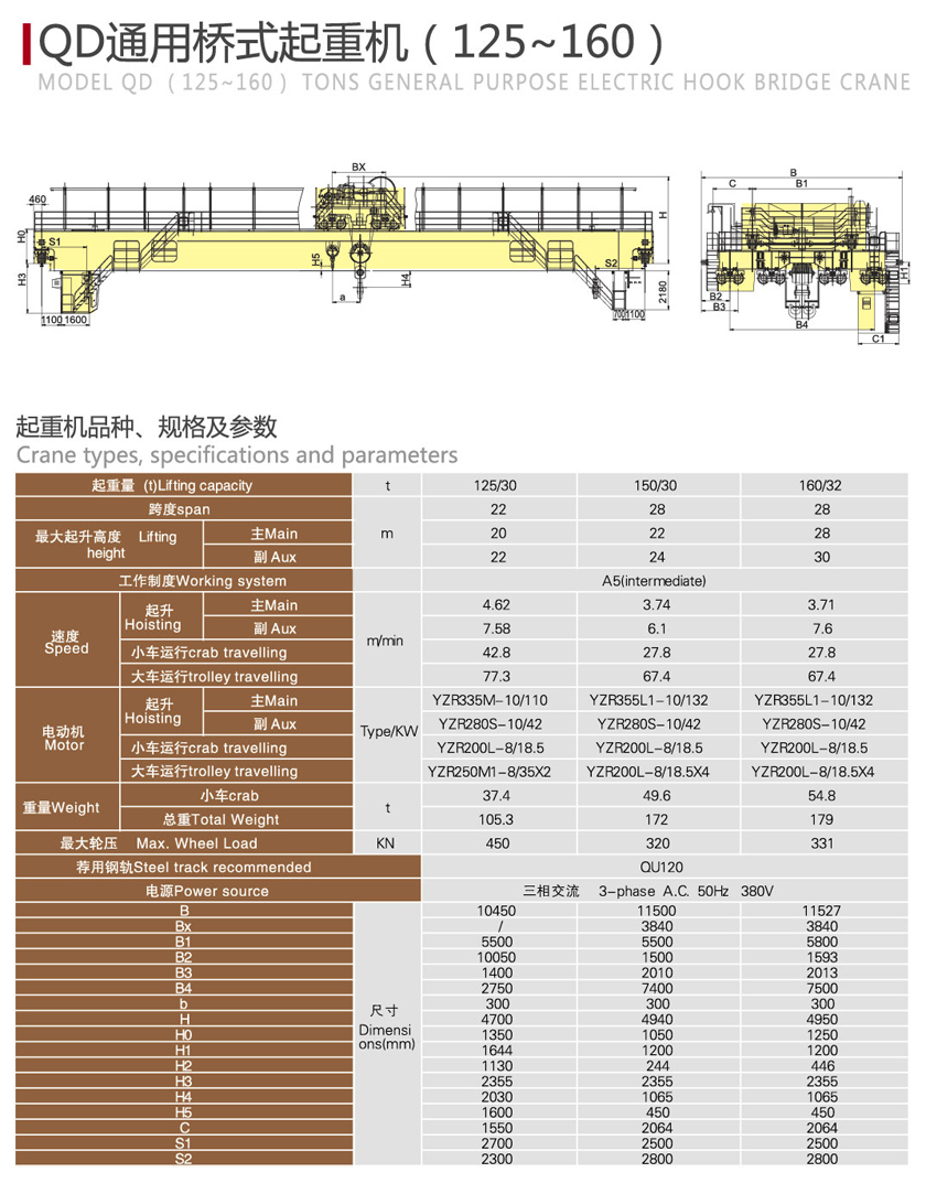 QD型吊鉤橋式起重機,主要由橋架、大車運行機構、小車、電器設備等組成。根據(jù)利用等級和載荷狀態(tài)不同,分為A5、A6二種工作級別。司機室平臺入口方向分側(cè)面入口,端面入口和頂面入口三種,沒有門為頂面入口。大車導電可用安全滑觸線也可用角鋼。該起重機動作操縱方式有地面操作、遙控和駕駛室操作,訂貨時需說明。
