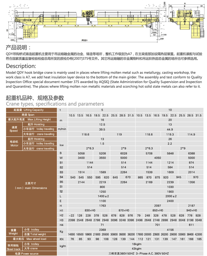 QDY吊鉤橋式鑄造起重機主要用于吊運熔融金屬的冶金、鑄造等場所,整機工作級別為A7,在主梁底部加設(shè)隔熱層裝置。起重機裝配與試驗符合國家質(zhì)量監(jiān)督檢驗檢疫總局所發(fā)的質(zhì)檢辦特[2007]375號文件。其它吊運熔融的非金屬物料和吊運熾熱固態(tài)金屬的場所也可參照選用。