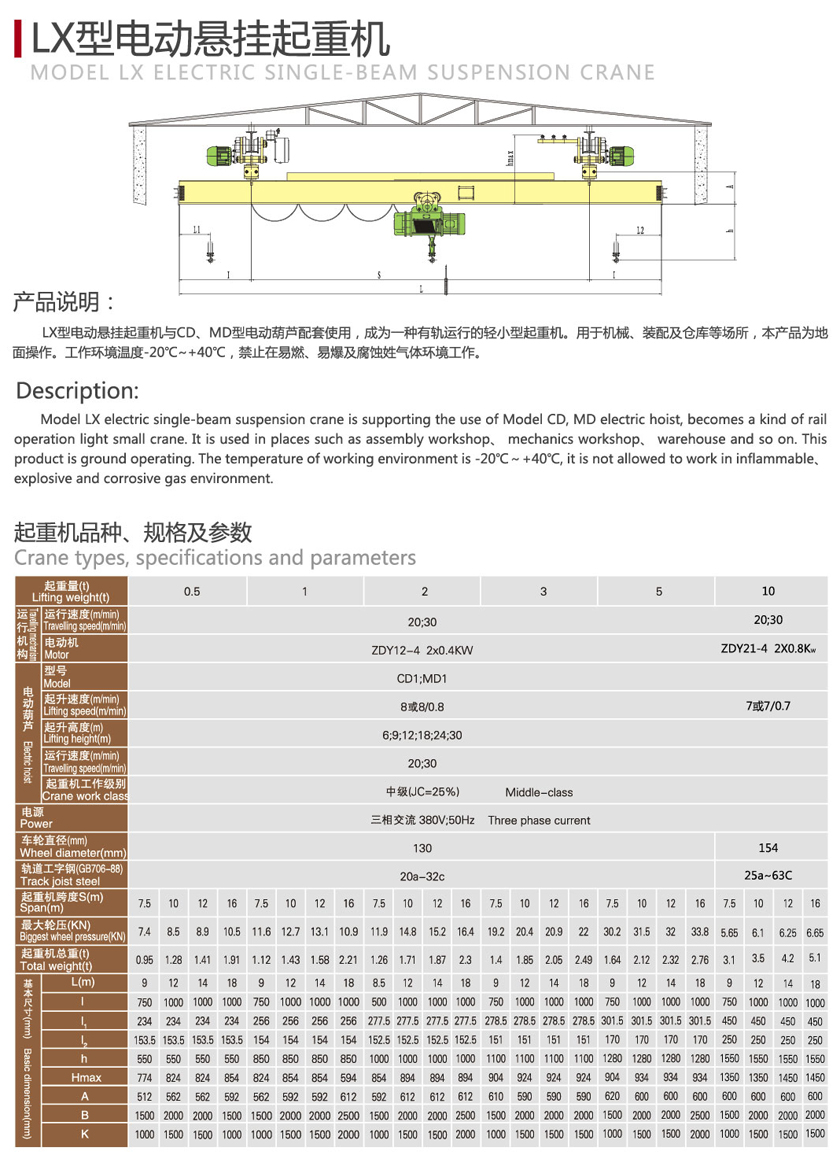 LX型電動(dòng)單梁懸掛起重機(jī)與CD、MD型電動(dòng)葫蘆配套使用,成為一種有軌運(yùn)行的輕小型起重機(jī)。用于機(jī)械、裝配及倉(cāng)庫(kù)等場(chǎng)所,本產(chǎn)品為地面操作。工作環(huán)境溫度-20℃~+40℃,禁止在易燃、易爆及腐蝕姓氣體環(huán)境工作。