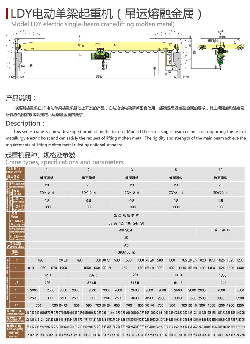 LDY電動單梁起重機在LD電動單梁起重機基礎(chǔ)上開發(fā)的產(chǎn)品,它與冶金電動葫蘆配套使用,能滿足吊運熔融金屬的要求,其主梁剛度和強度及所有符合國家規(guī)范規(guī)定的吊運熔融金屬的要求。
